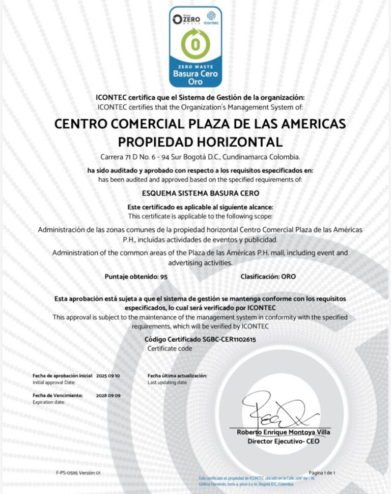 The Plaza de las Americas Shopping Center obtained the Gold Certification of the SGZW, after reaching a sustainable disposal of 69 % of its wastes, equivalent to more than 625.5 tons responsibly managed.
